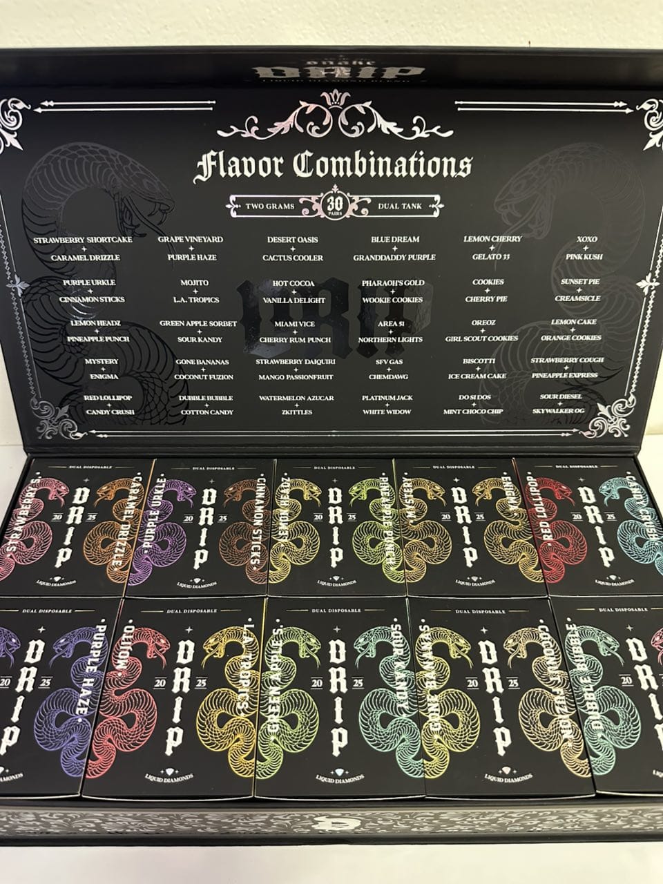 Snake Drip’s dual blend lineup features sophisticated strain pairings designed for balance and complexity. Some popular combinations include: